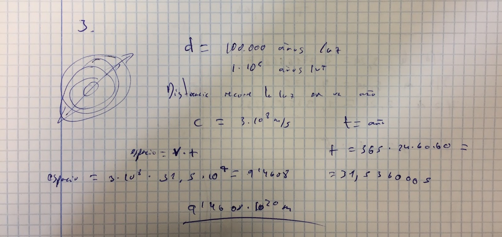 El tercero, era saber el tamaño de la Vía Láctea, sabiendo que tiene una distancia de 100.000 años luz o 1·10⁵ años luz y sabiendo que la velocidad de la luz es de 3·10⁸m/s.